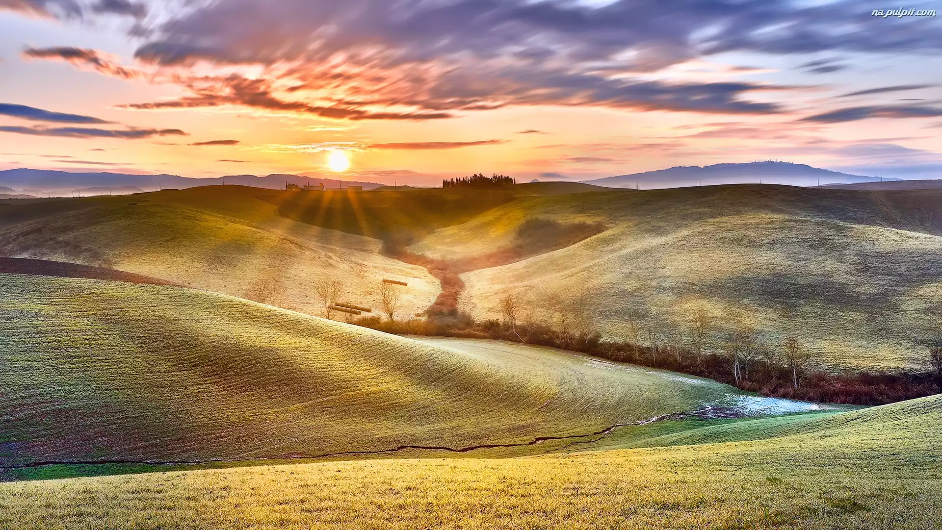 Prowincja Chieti, Wzgórza, Pola, Trawa, Abruzja, Włochy, Drzewa, Wschód słońca, Villamagna Na Pulpit |