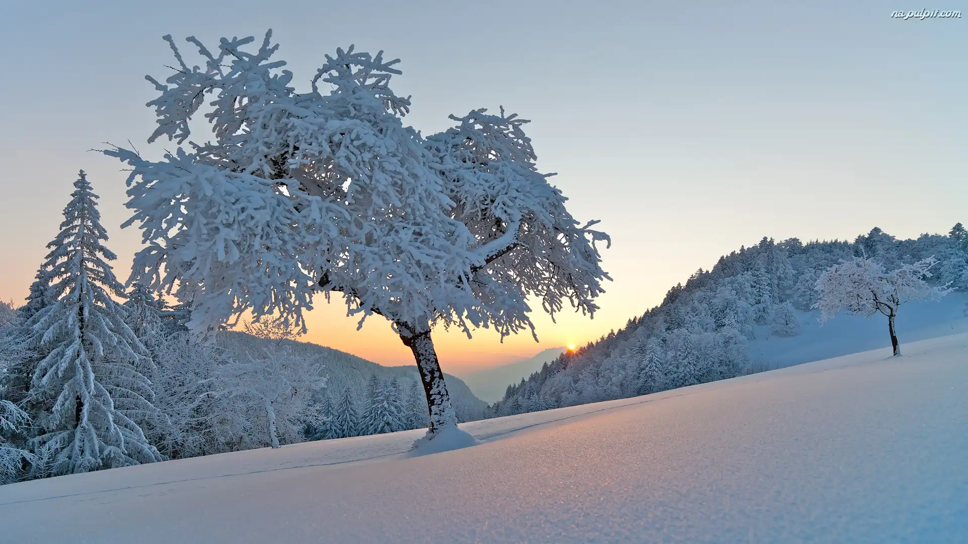 Wzgórza, Drzewa, Zima, Wschód słońca Na Pulpit