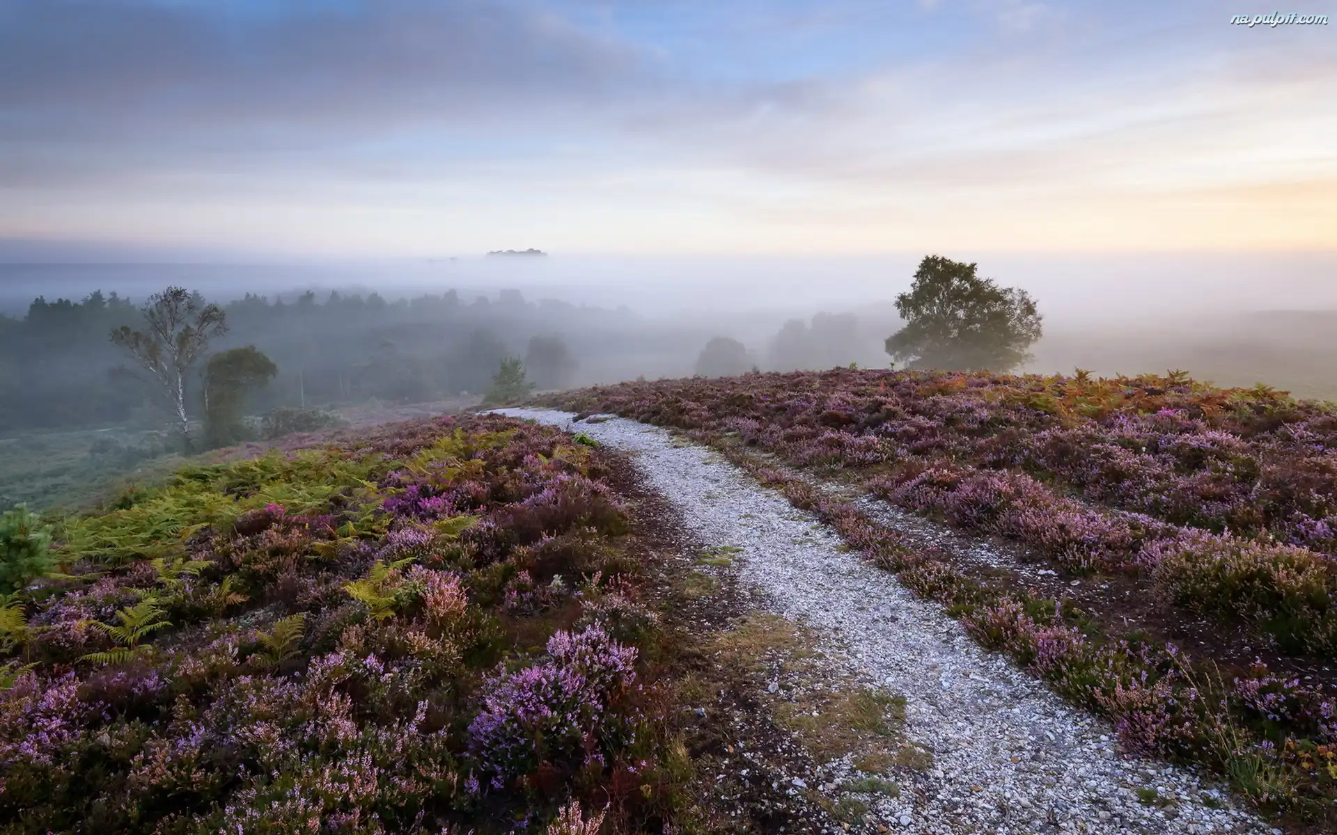 Poranek, Wzgórze, Drzewa, Wrzosowisko, Wrzosy, Droga, Mgła