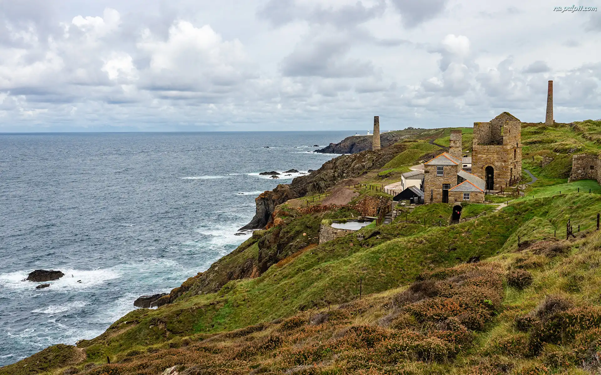 Wzgórze, Morze, Chmury, Domy, Wybrzeże, Skały Na Pulpit