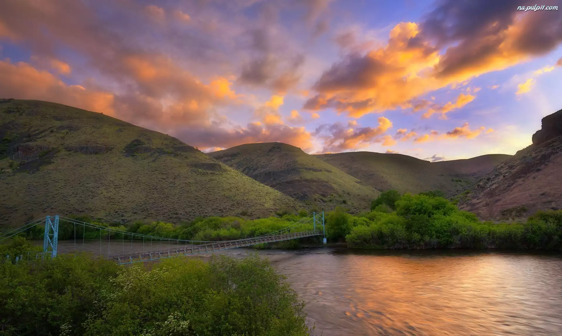 Waszyngton, Góry, Most, Rzeka Yakima, Roślinność, Zachód słońca, Chmury, Drzewa, Stany Zjednoczone, Umtanum Ridge Na Pulpit |