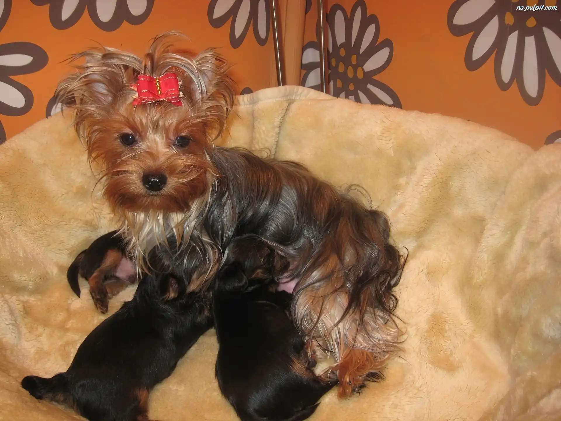 Yorkshire Terrier, trzy, suka, karmiąca, szczeniaki Na Pulpit