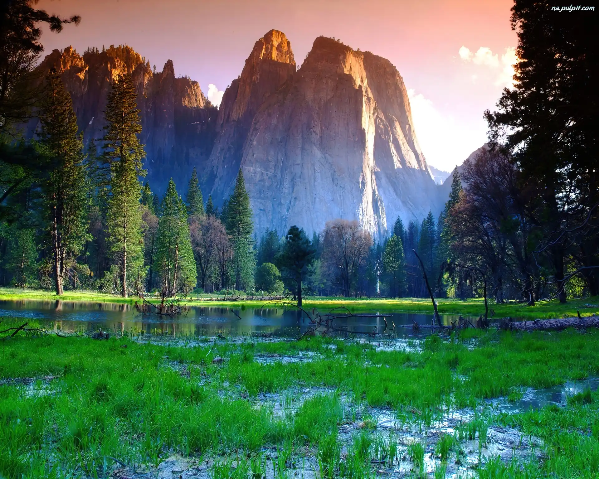 Yosemite, Góry, Woda, Łąka, Drzewa Na Pulpit