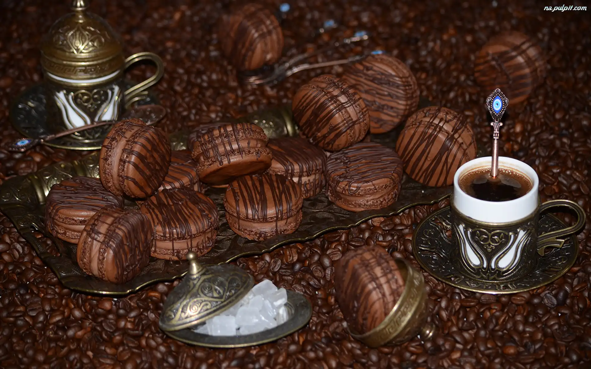 Makaroniki, Łyżeczka, Ciasteczka, Kawa, Talerzyk, Filiżanka, Ziarna