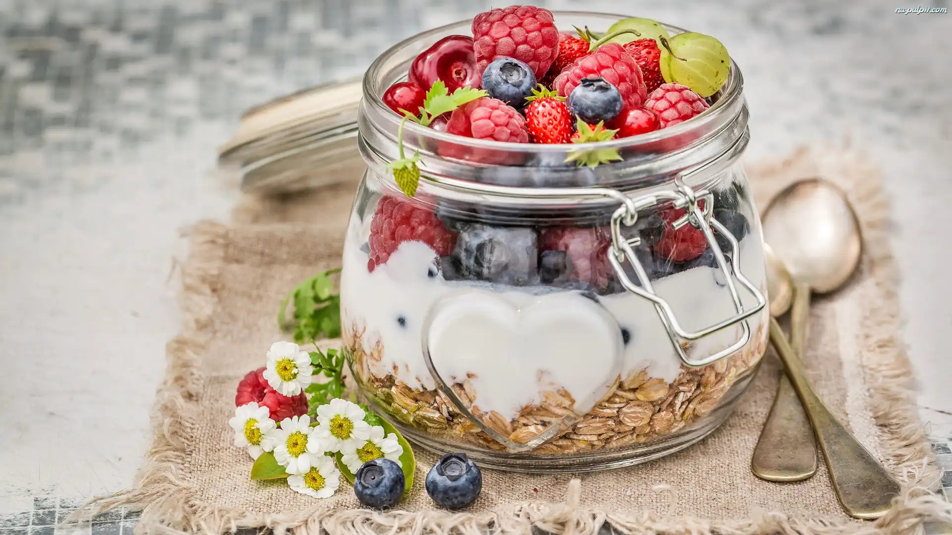 Łyżeczki, Jogurt, Płatki owsiane, Słoik, Owoce Na Pulpit