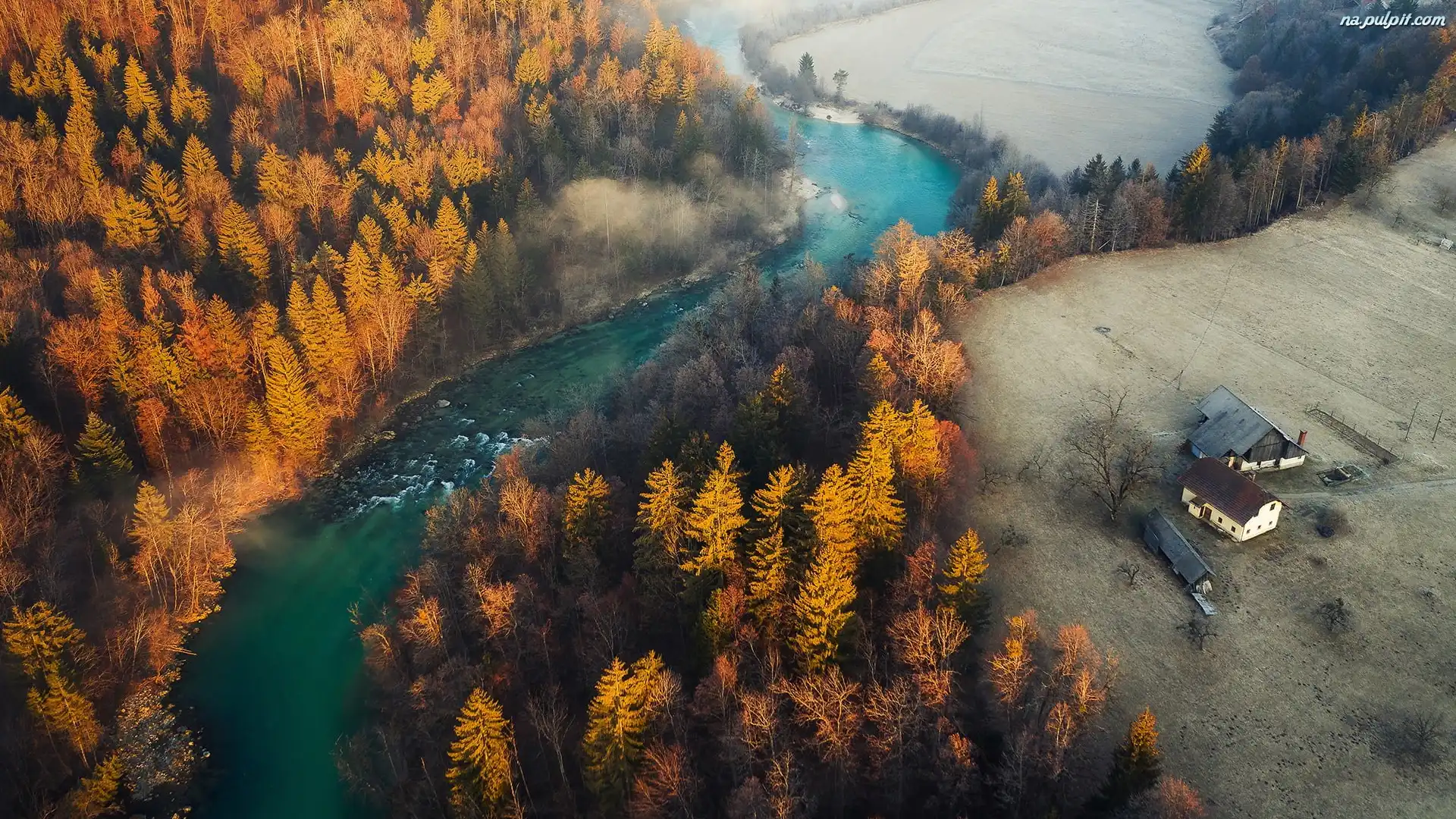 Domy, Rzeka Sava, Mgła, Pożółkłe, Z lotu ptaka, Słowenia, Drzewa, Jesień, Polana
