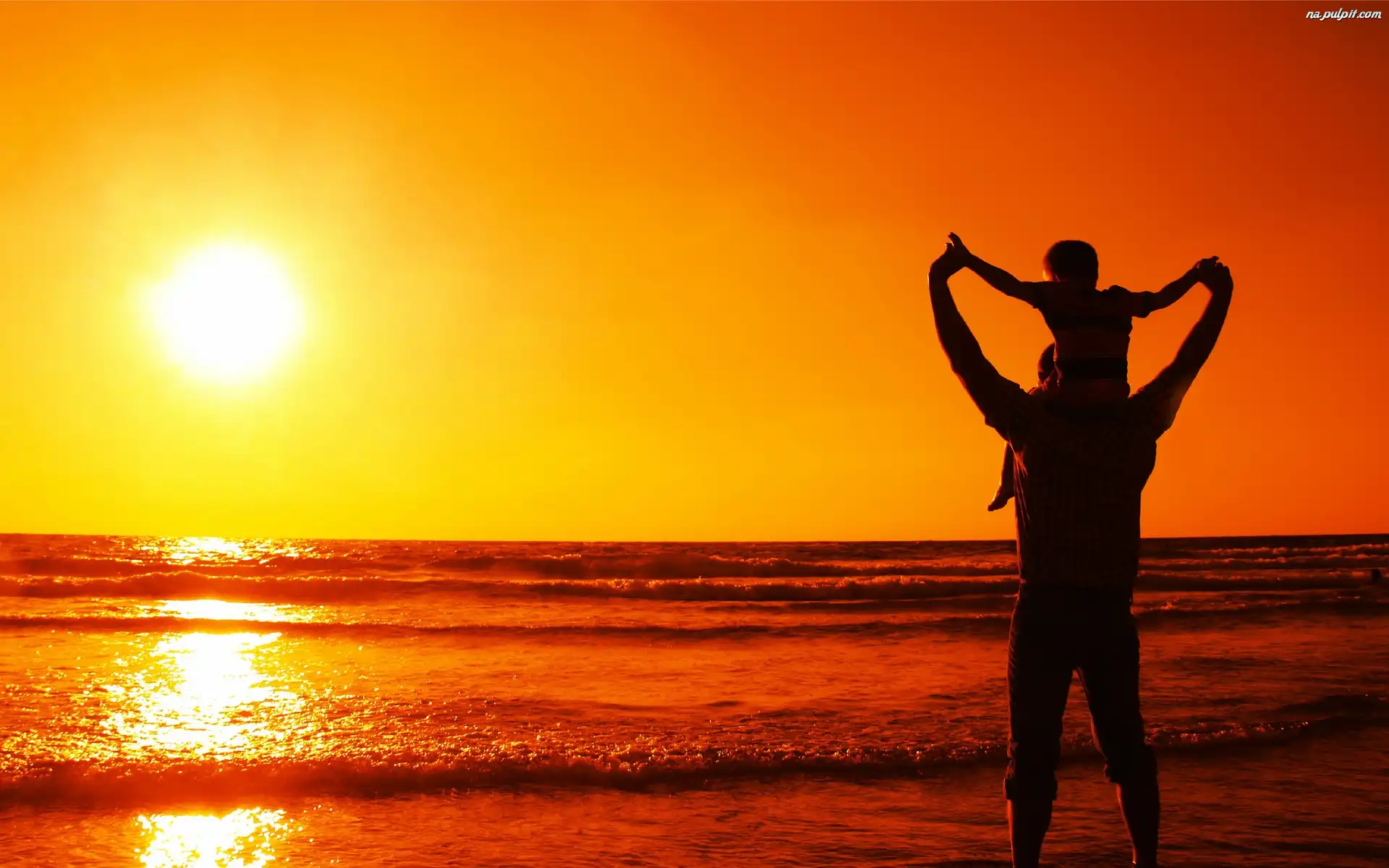 Z, Fale, Słońce, Synem, Ojciec, Morze Na Pulpit