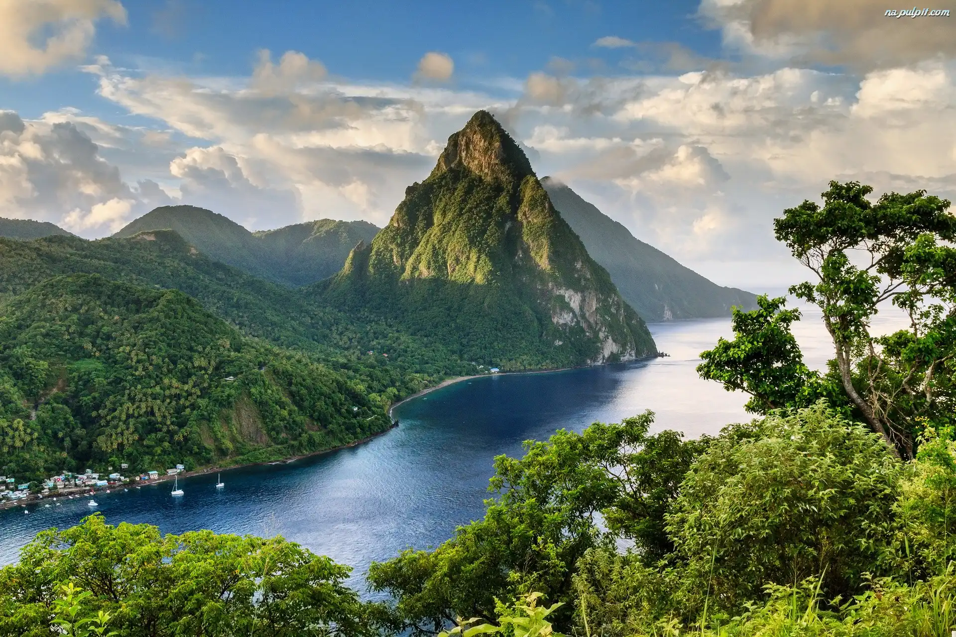 Zabudowania, Rzeka, Góry, Zieleń Na Pulpit