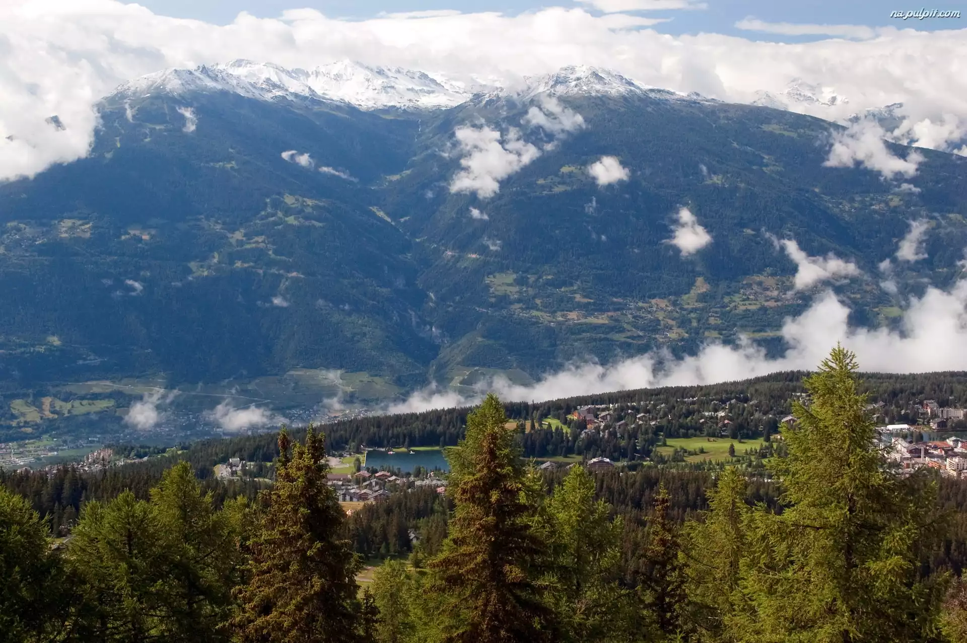 Zabudowania, Góry, Mgła, Drzewa Na Pulpit