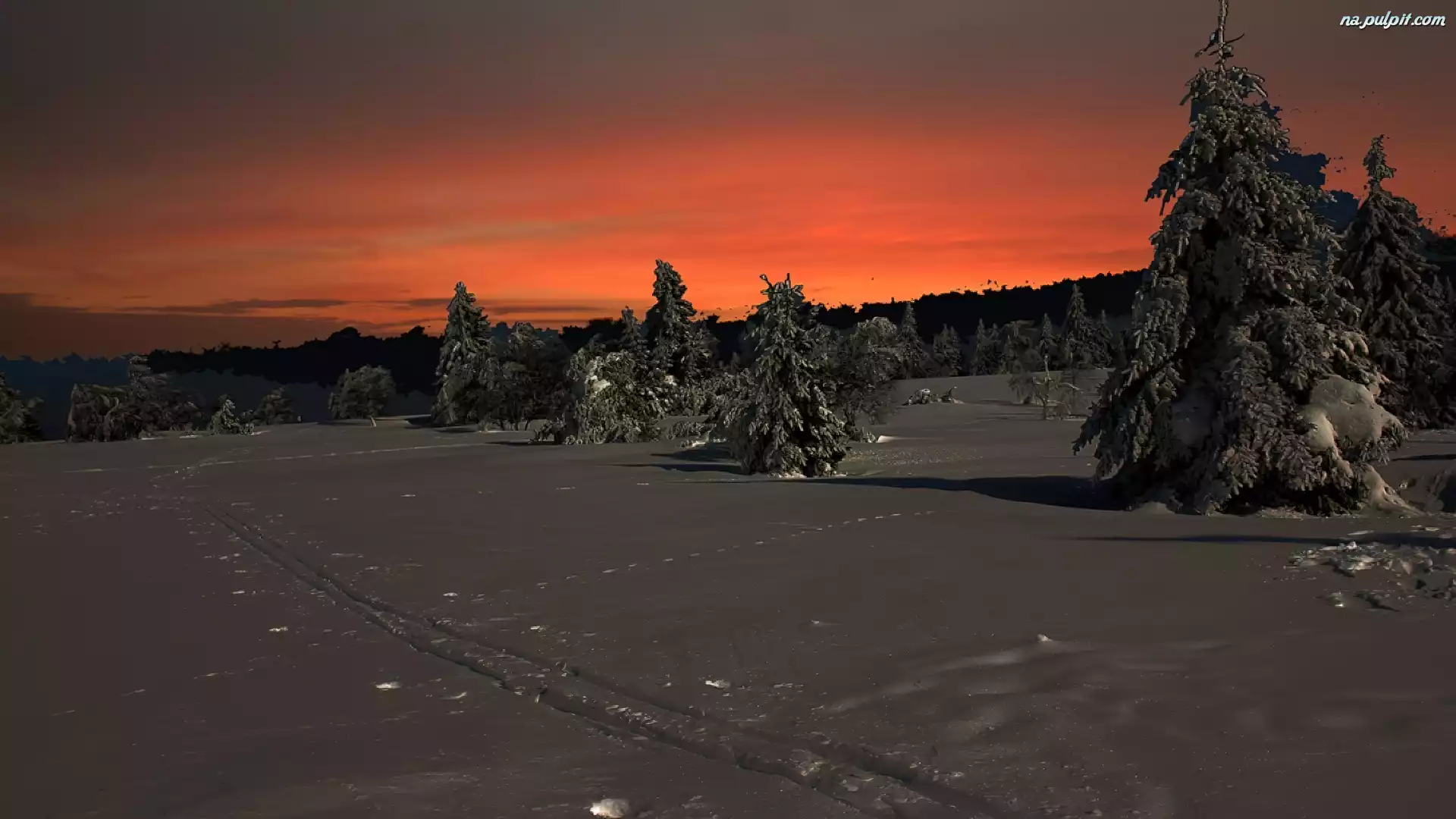 Zachód Słońca, Niebo, Pomarańczowe, Choinki, Zima Na Pulpit