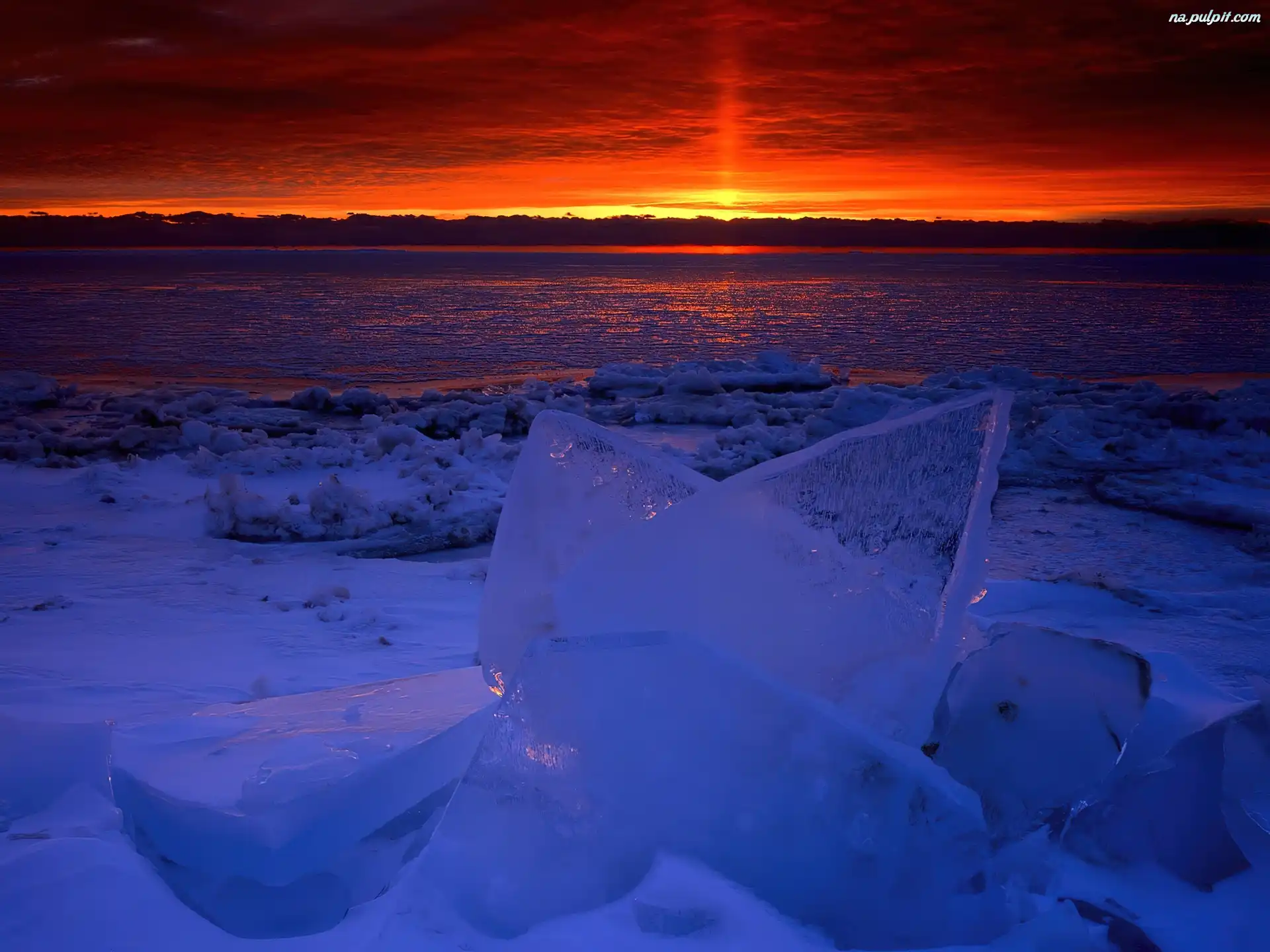 Zachód, Kawłki, Lodu, Słońca, Czerwony, Jezioro