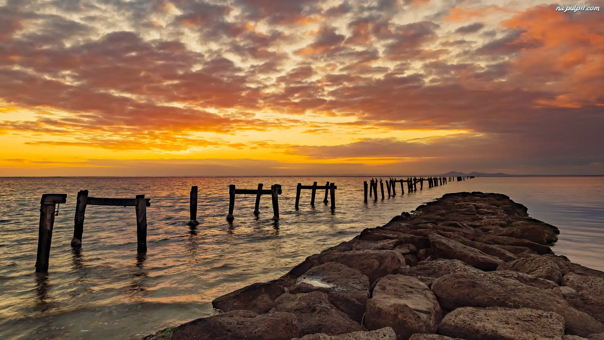 Drewniane, Zachód słońca, Chmury, Pale, Morze, Skały Na Pulpit