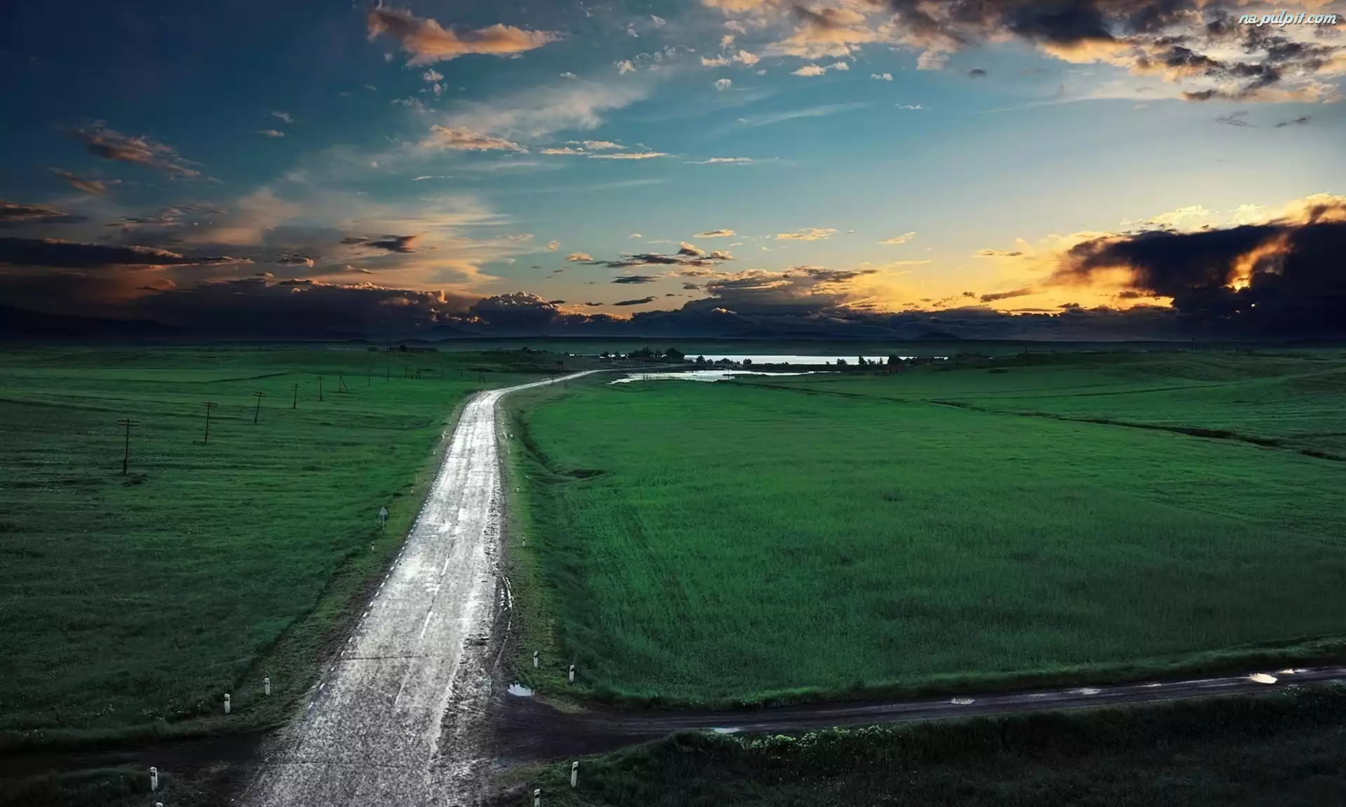Zachód Słońca, Łąki, Polna, Droga, Woda Na Pulpit