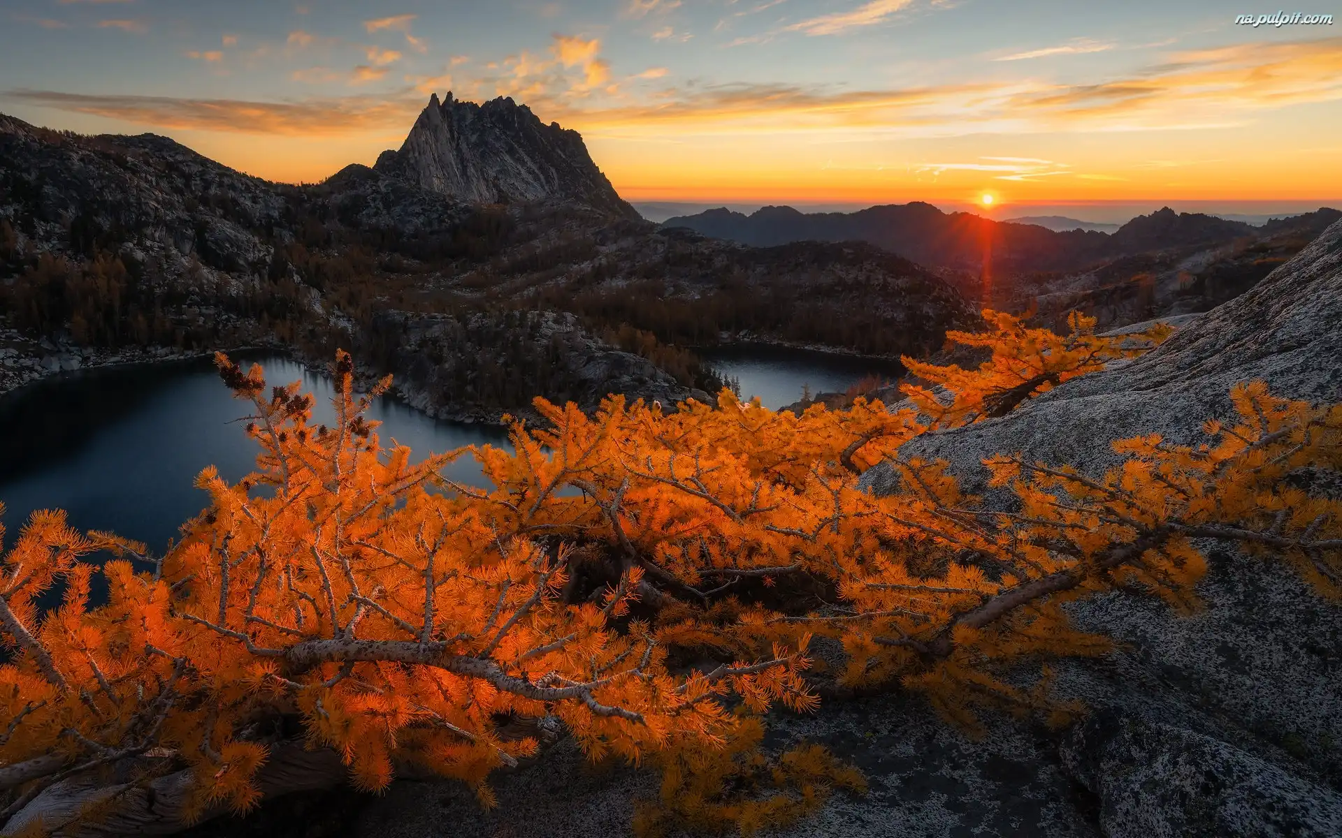 Jesień, Góry, Jezioro, Zachód słońca, Drzewa Na Pulpit