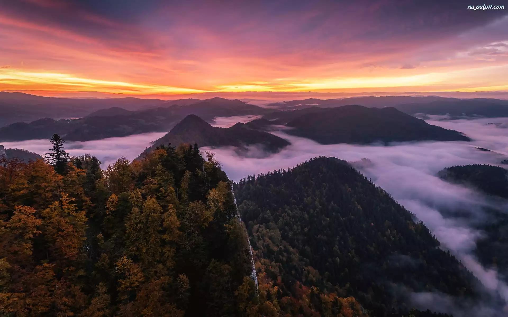 Mgła, Góry, Las, Zachód słońca, Drzewa Na Pulpit