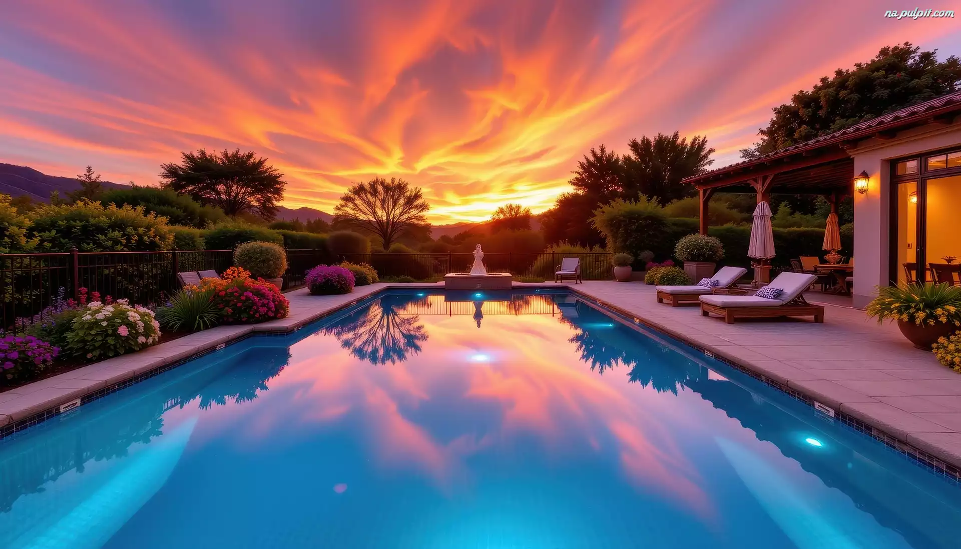 Chmury, Basen, Leżaki, Zachód słońca, Drzewa