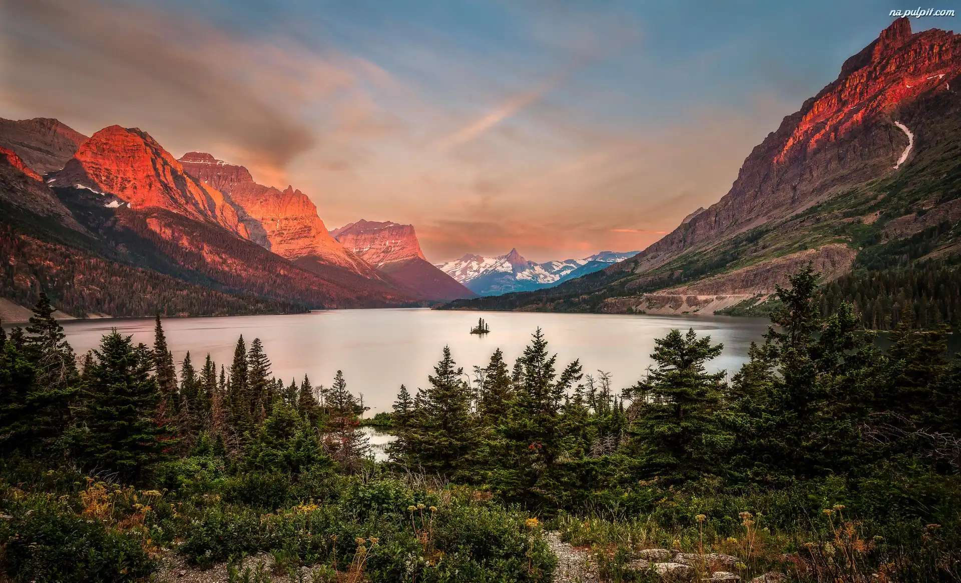 Zachód słońca, Jezioro, Saint Mary Lake, Góry Skaliste, Montana, Stany Zjednoczone, Drzewa, Park Narodowy Glacier, Chmury Na Pulpit |