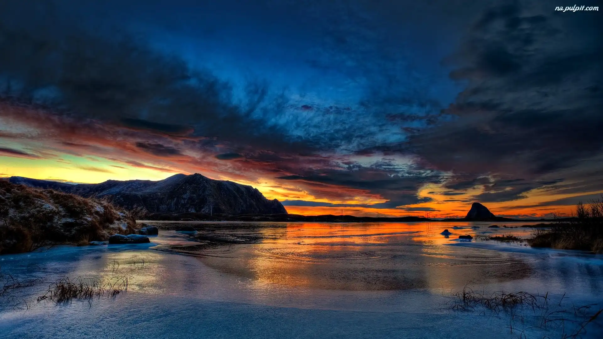 Zachód Słońca, Chmury, Góry, Jezioro Na Pulpit