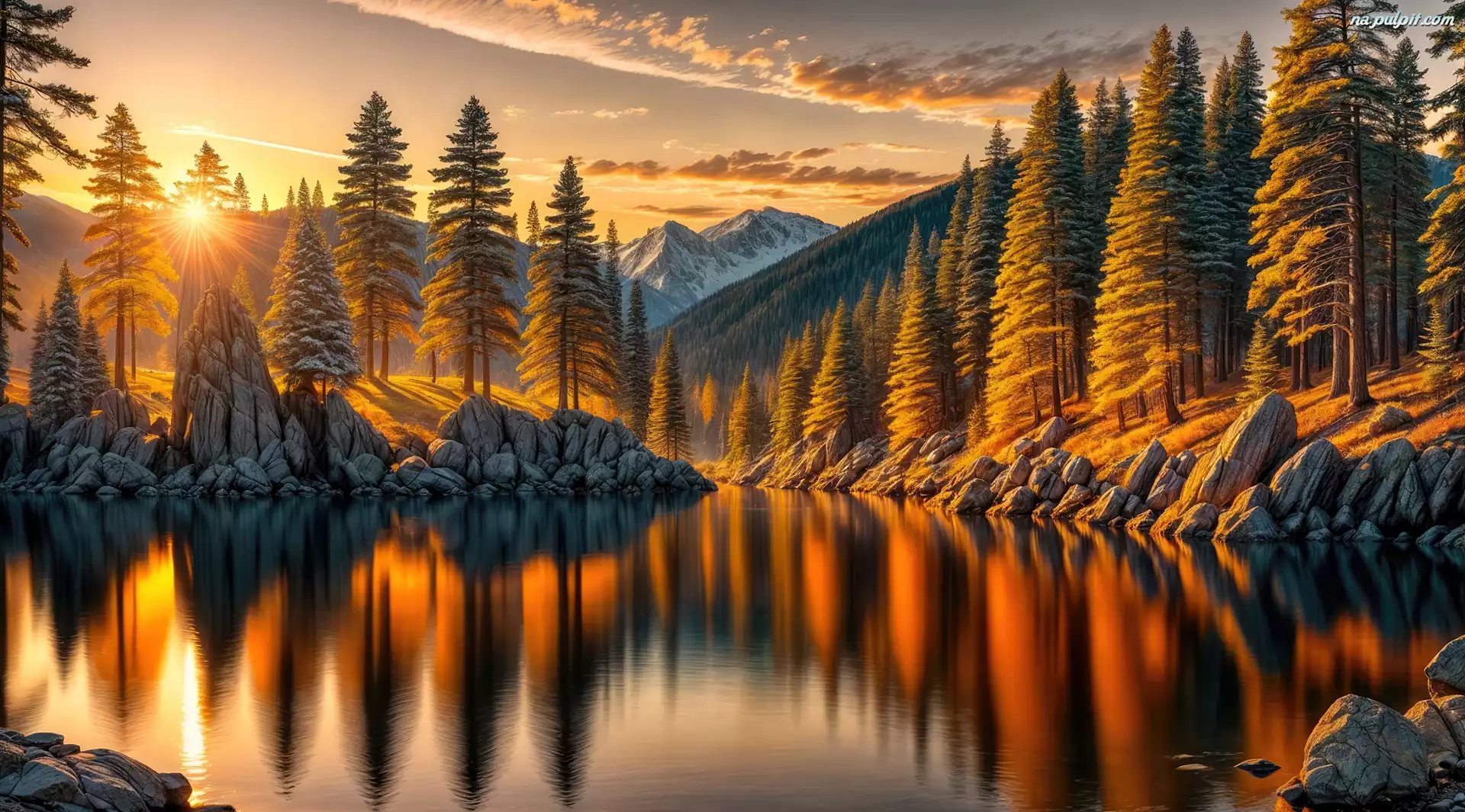 Jesień, Jezioro, Góry, Zachód słońca, Drzewa, Grafika