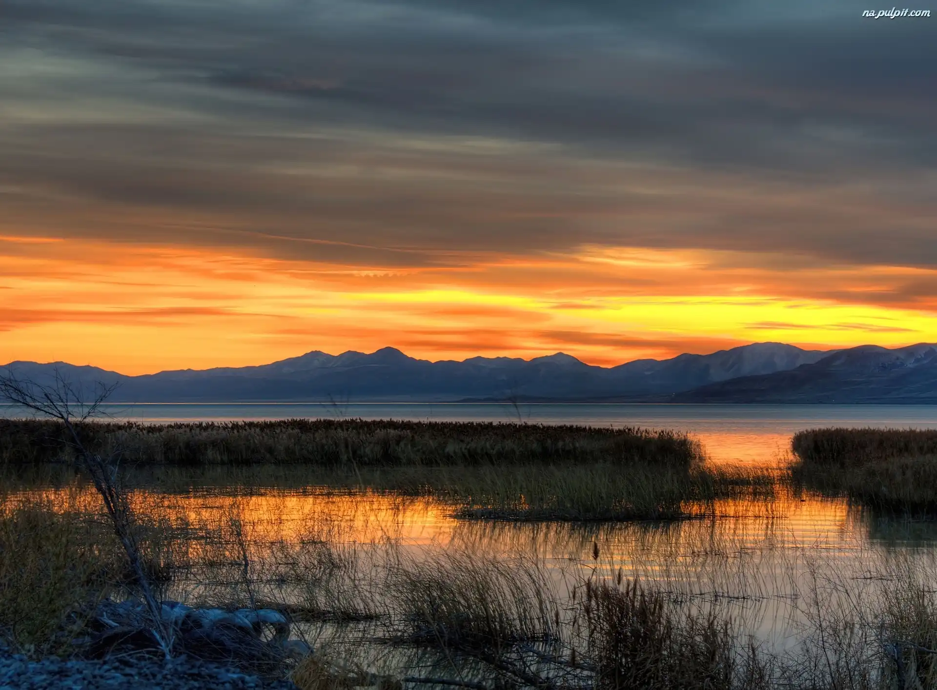 Zachód Słońca, Jezioro, Góry, Zarośla Na Pulpit