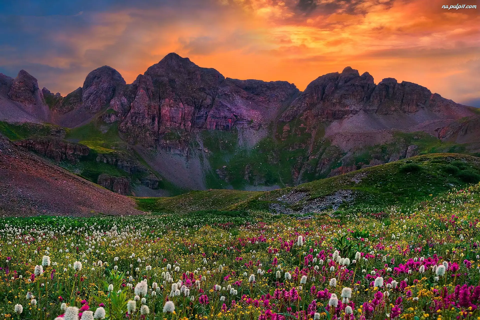 Kolorowe, Kwiaty, Góry, Zachód słońca, Łąka, Niebo Na Pulpit