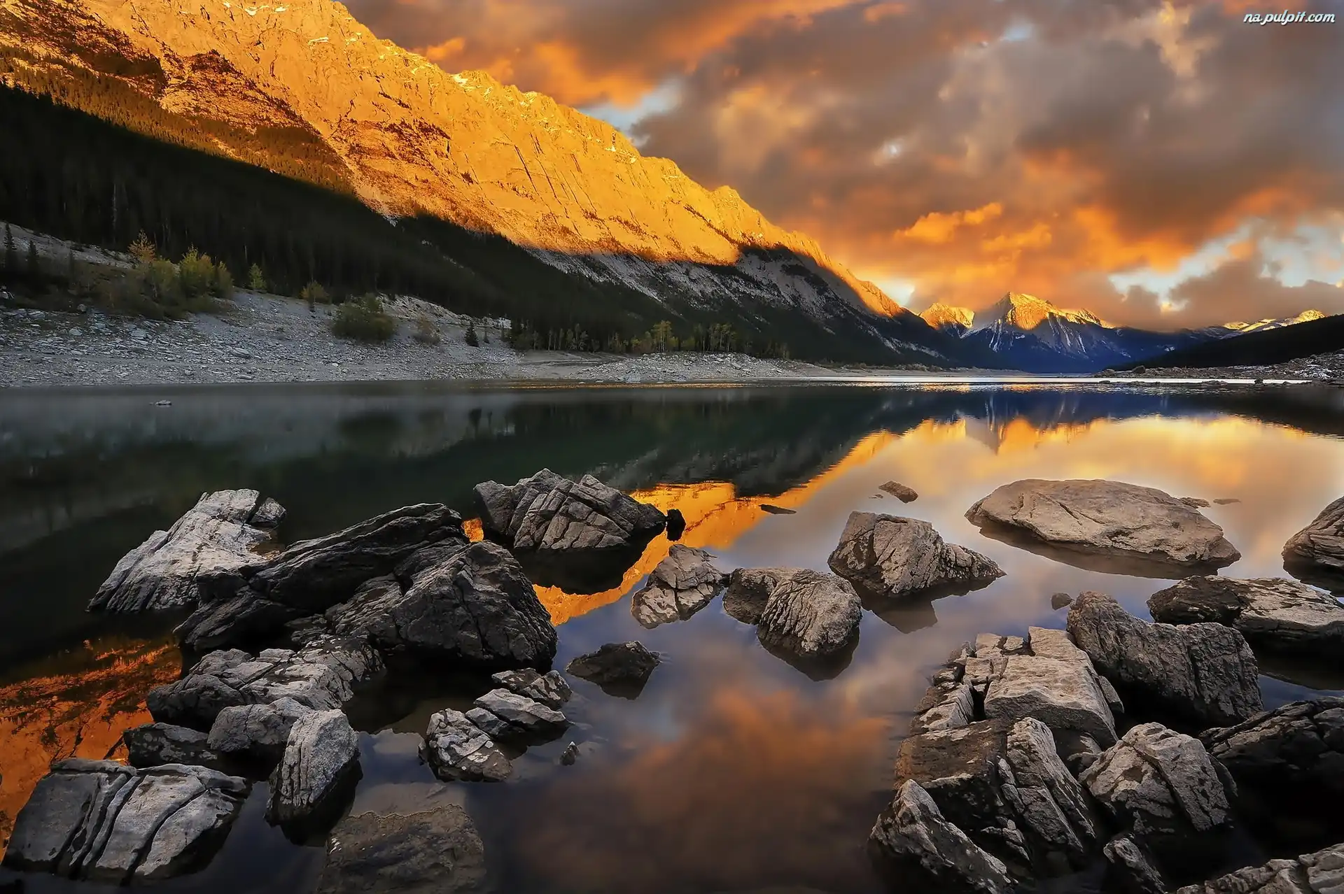 Zachód Słońca, Rzeka, Góry, Kamienie Na Pulpit
