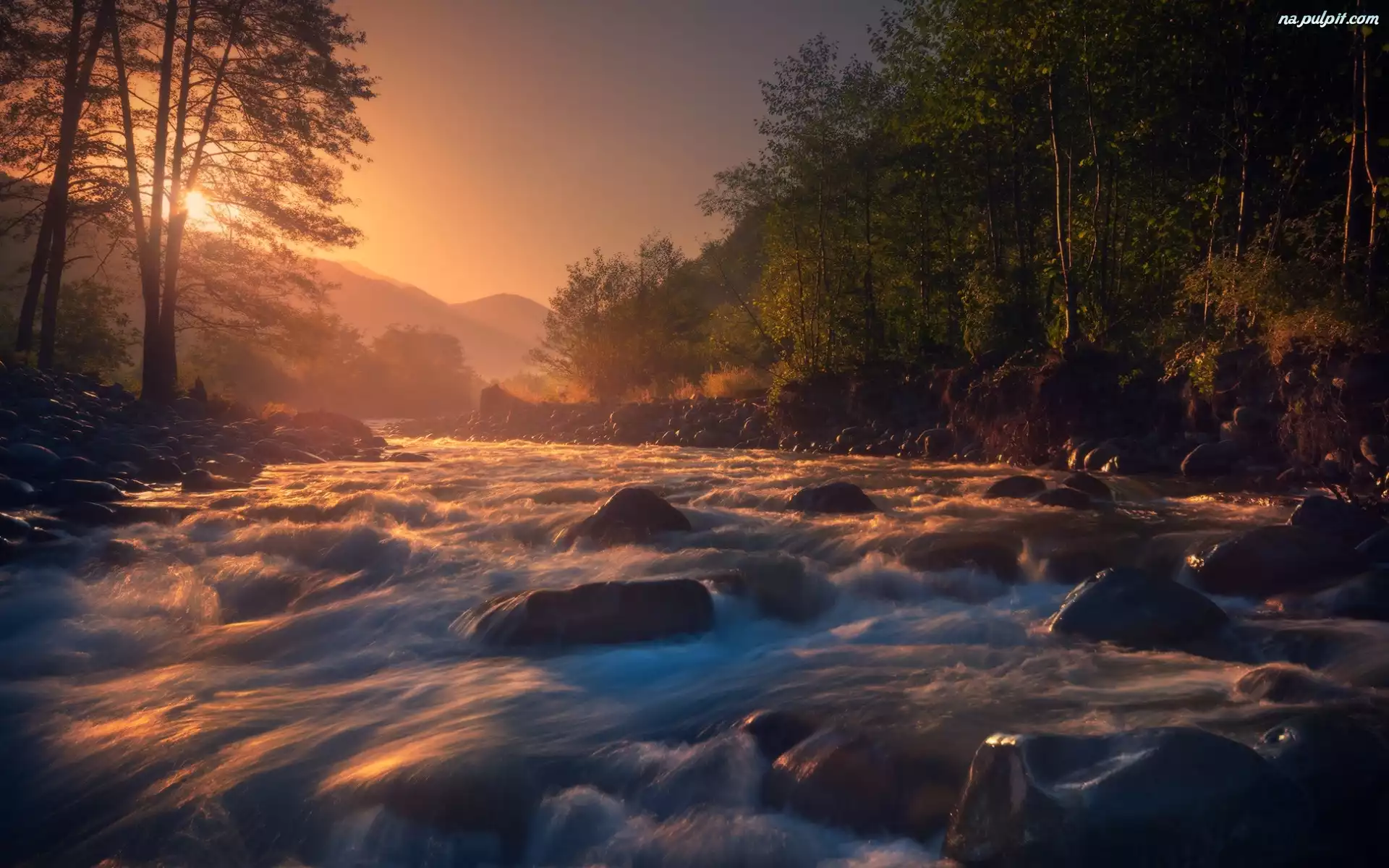 Gruzja, Zachód słońca, Kamienie, Rzeka Rioni, Mgła Na Pulpit
