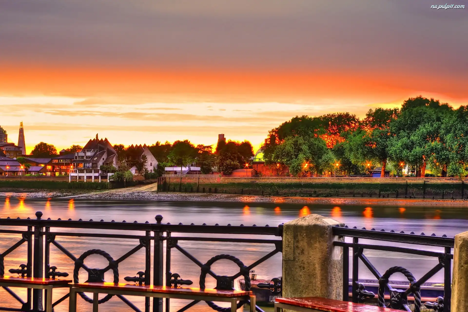 HDR, Zachód słońca, Domy, Rzeka, Balustrada Anglia Na Pulpit