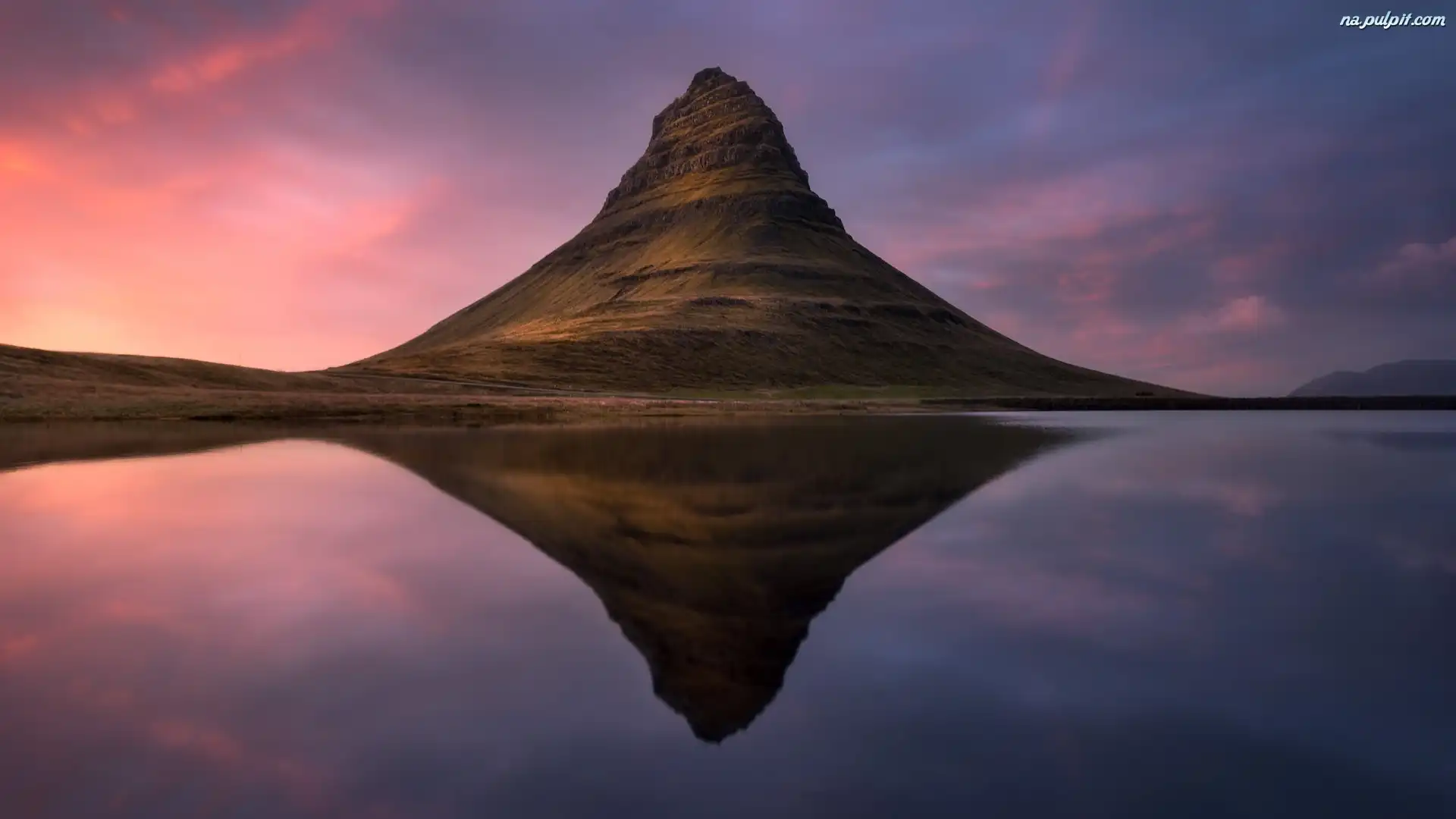 Islandia, Zachód słońca, Jezioro, Góra Kirkjufell, Odbicie Na Pulpit