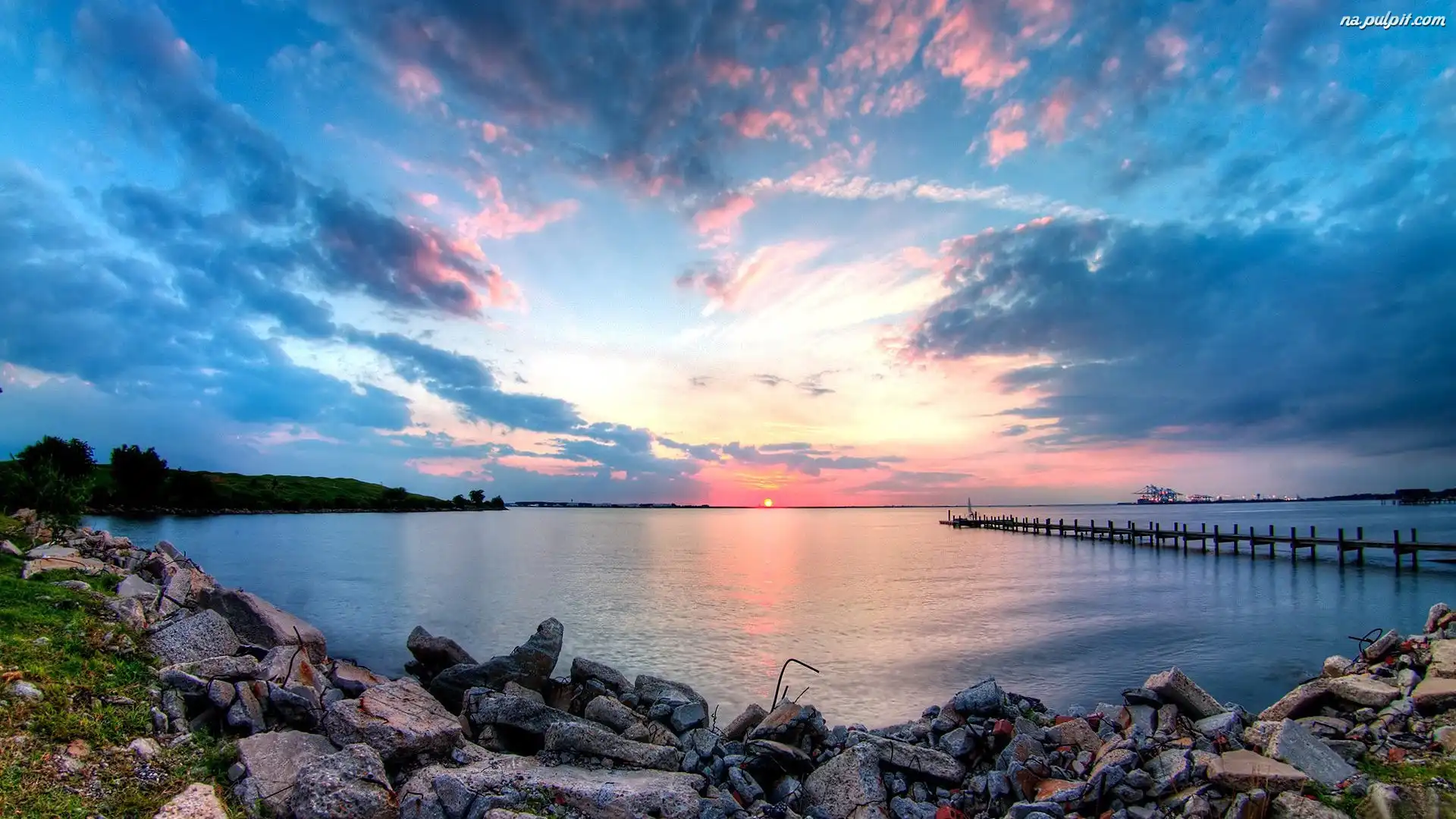 Zachód Słońca, Kamienie, Jezioro, Pomost