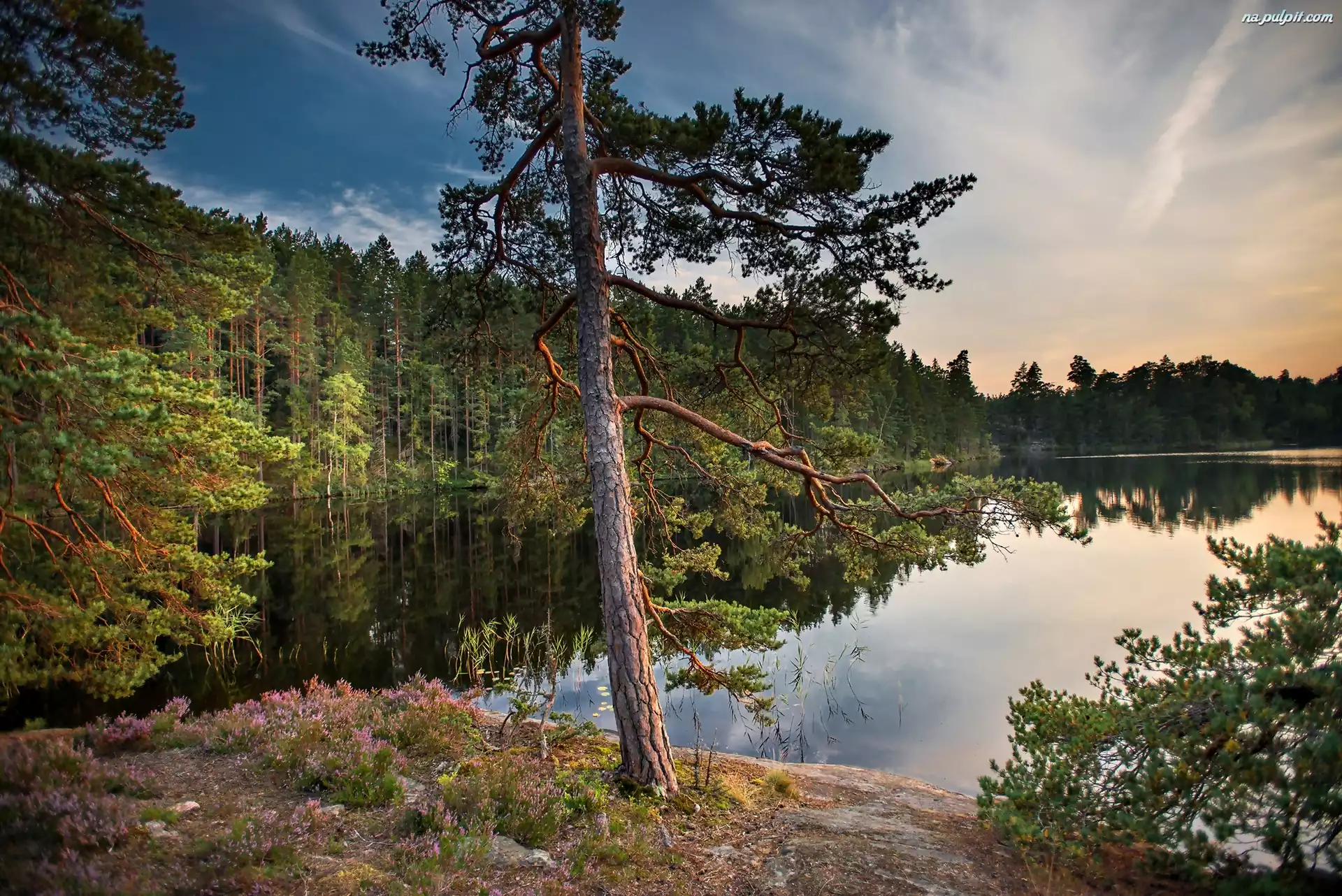 Zachód Słońca, Las, Jezioro, Drzewo Na Pulpit