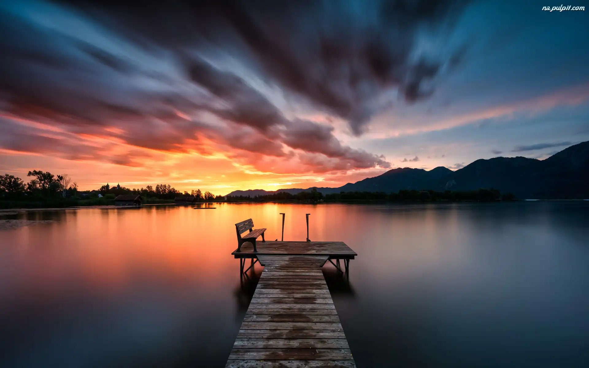 Zachód słońca, Pomost, Jezioro, Ławka Na Pulpit