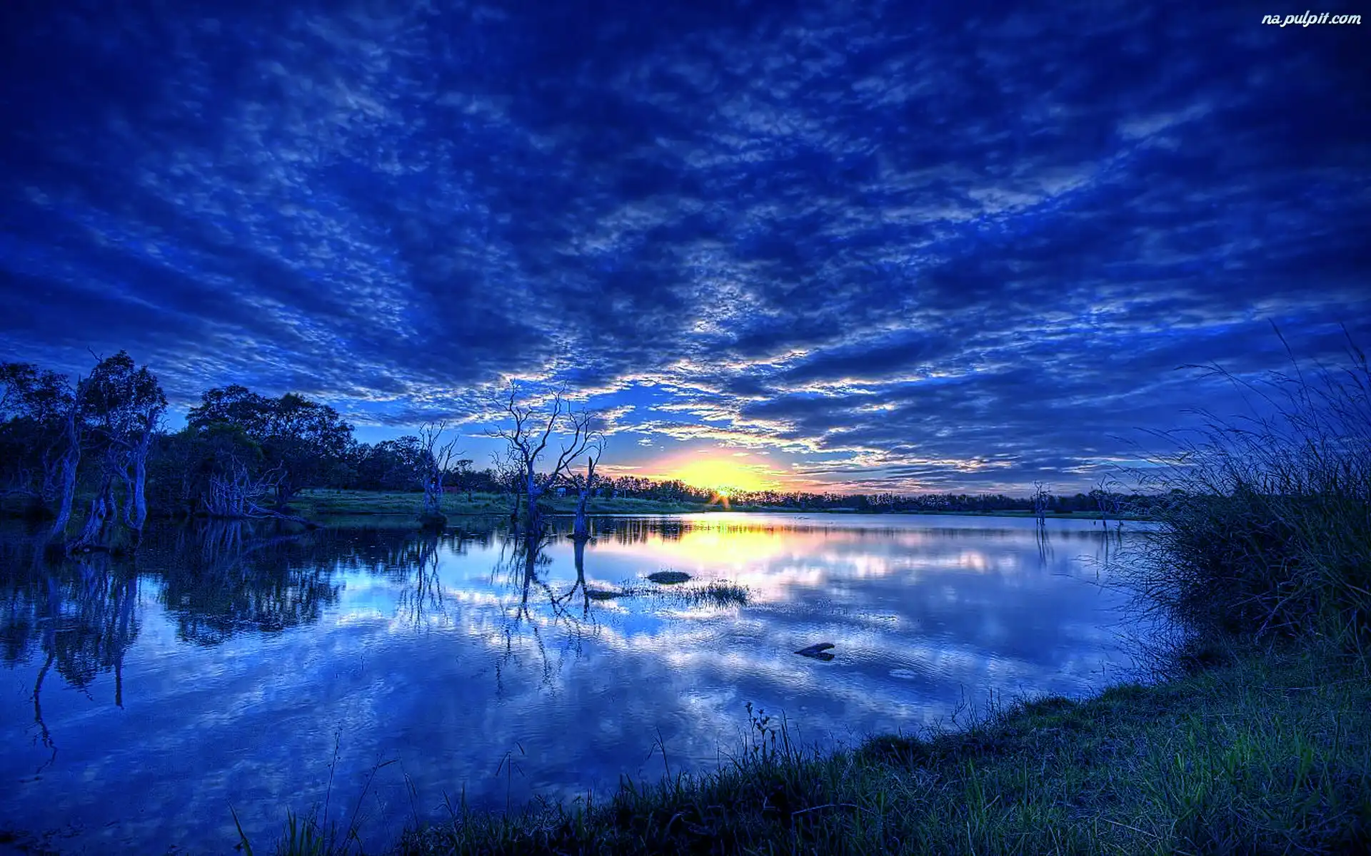 Zachód Słońca, Jezioro, Chmury Na Pulpit