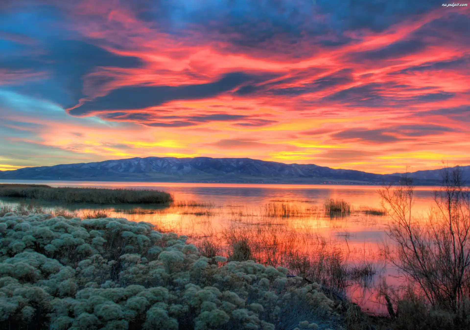 Zachód Słońca, Jezioro, Zarośla Na Pulpit