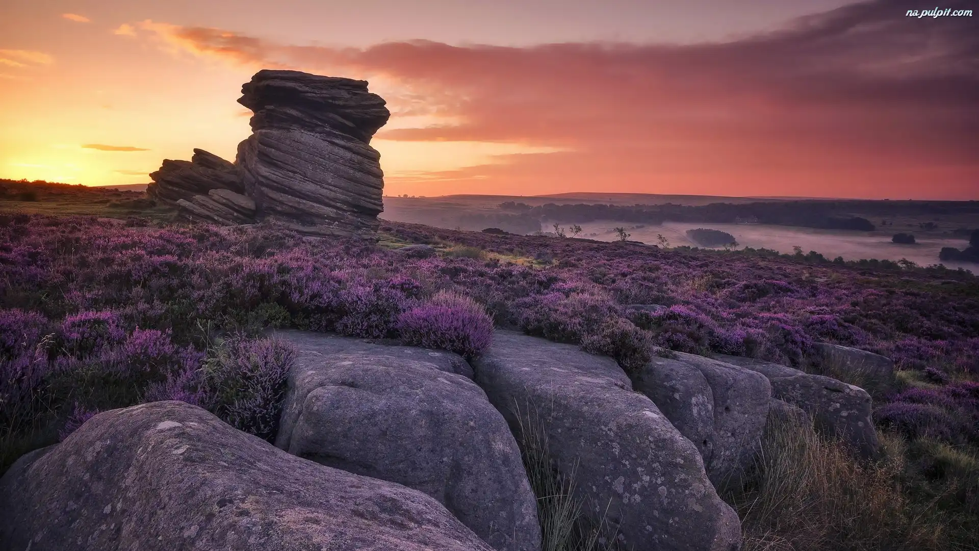Zachód słońca, Wrzosowisko, Skały, Kamienie, Wrzos Na Pulpit