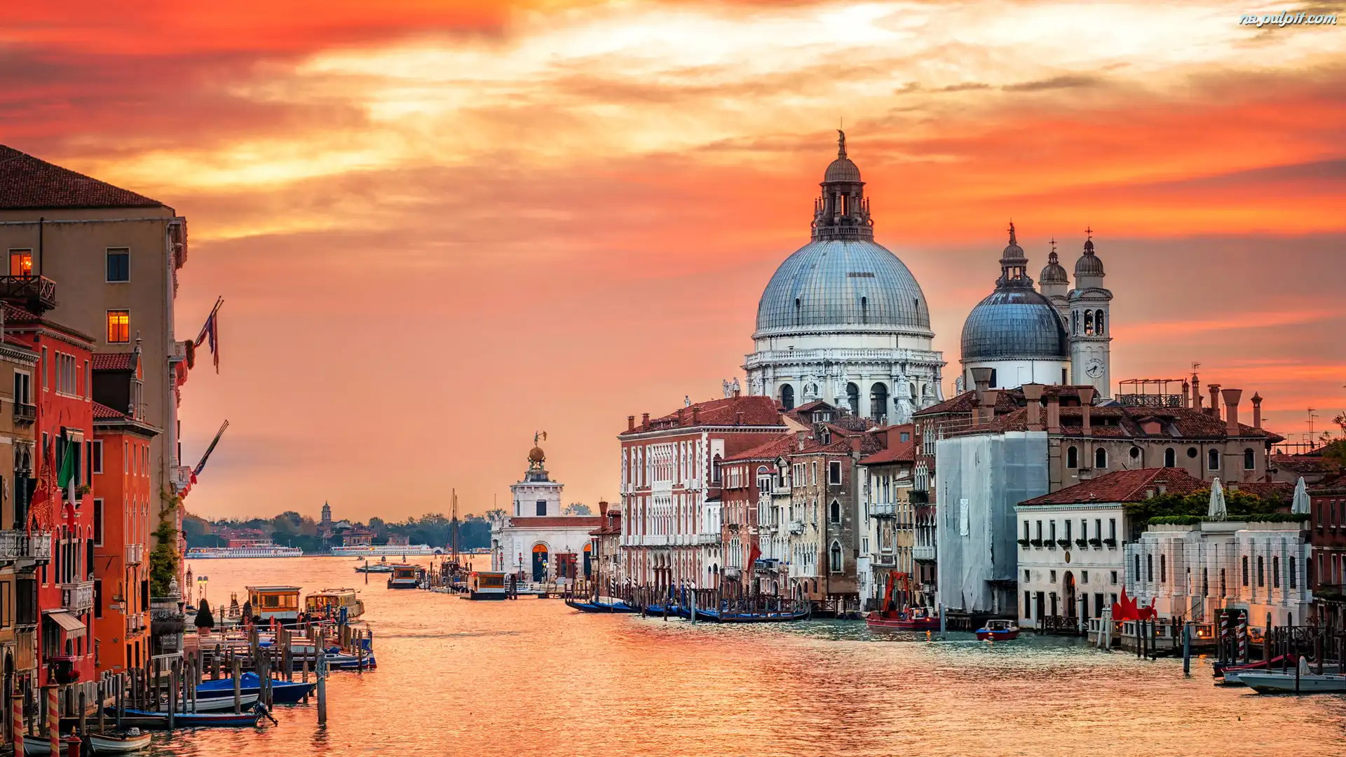 Wenecja, Domy, Zachód słońca, Kanał Canal Grande,  Włochy, Bazylika św. Marka Na Pulpit