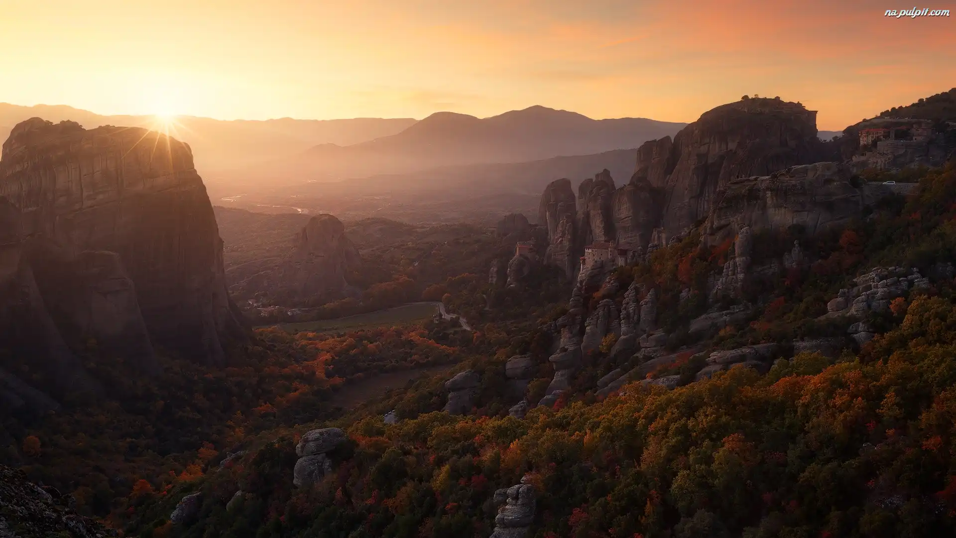 Klasztor Warłama, Góry, Masyw skalny, Zachód słońca, Skały, Meteory, Grecja, Monastyr Varlaam Na Pulpit |