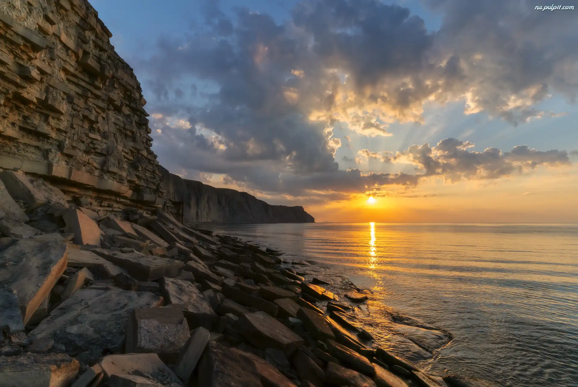 Morze, Wybrzeże, Skały, Zachód słońca, Klif Na Pulpit
