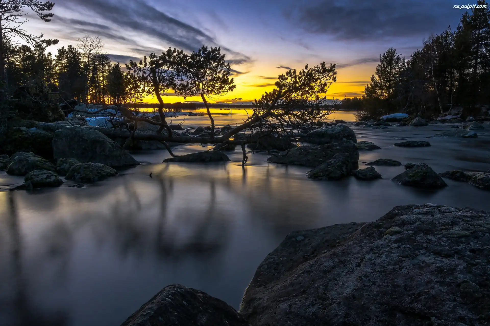 Laponia, Zachód słońca, Drzewa, Rzeka, Szwecja, Kamienie Na Pulpit