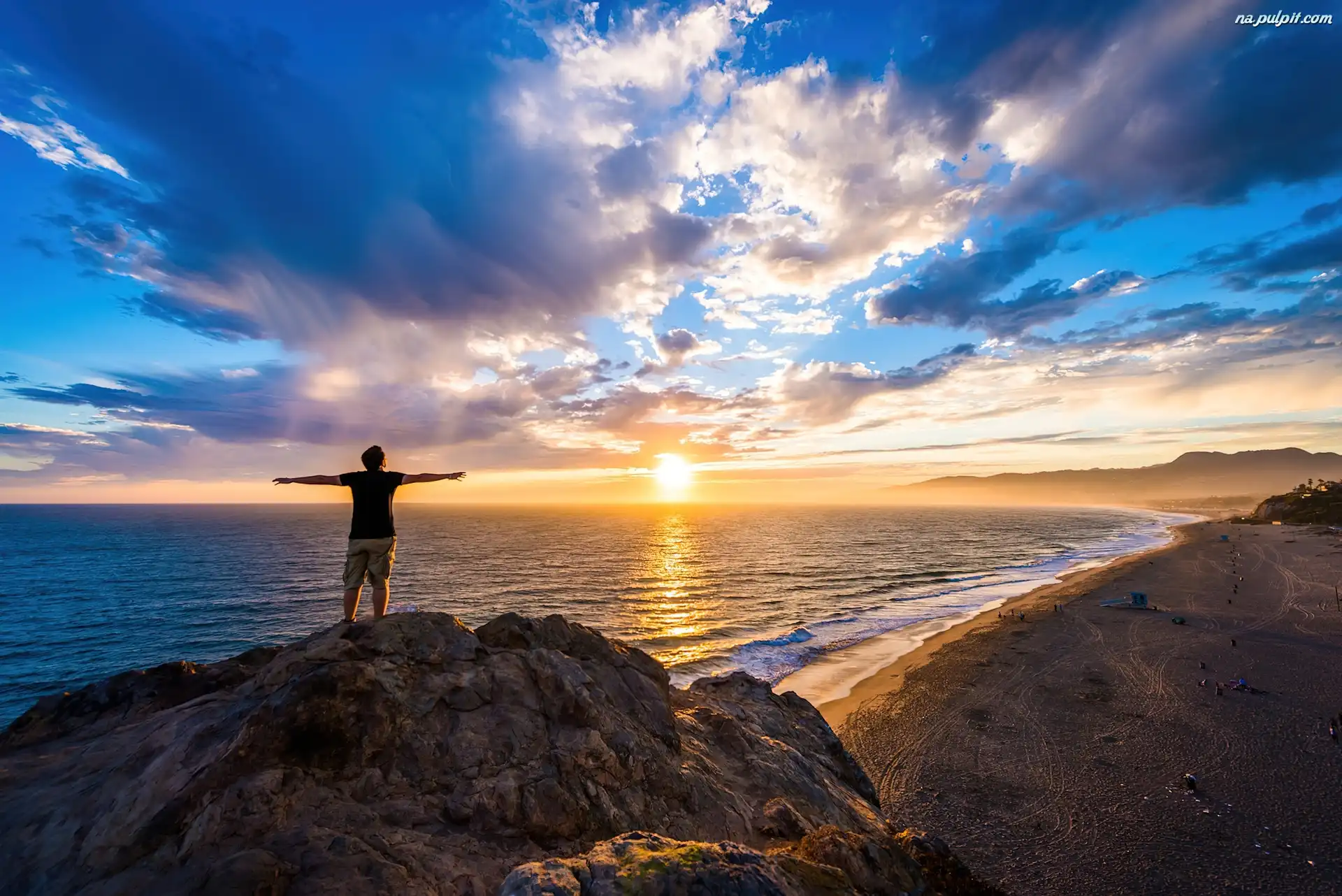 Zachód Słońca, Skała, Morze, Mężczyzna, Chmury Na Pulpit