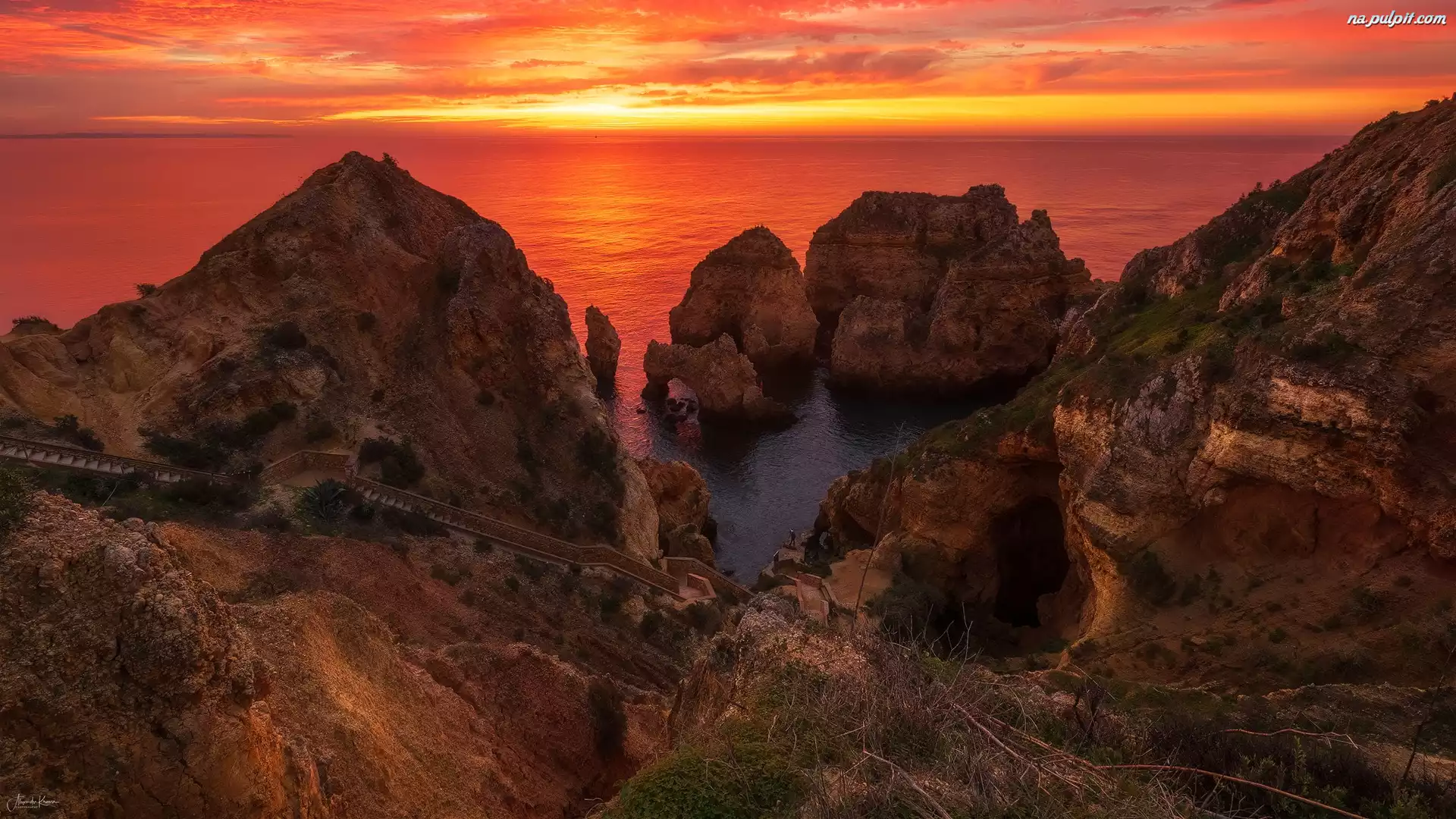 Skały, Portugalia, Algarve, Zachód słońca, Morze Na Pulpit