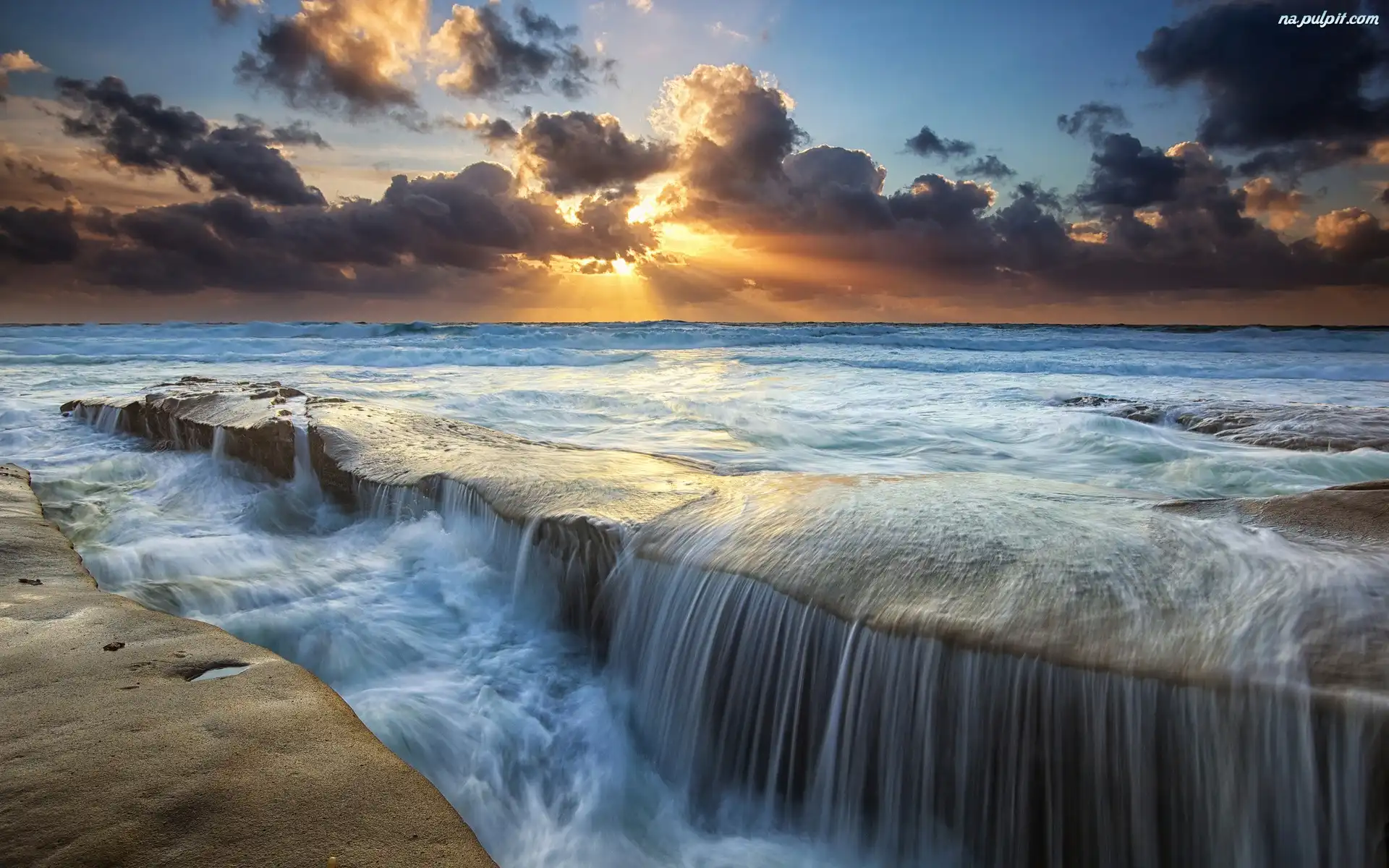 Zachód Słońca, Fale, Morze, Chmury Na Pulpit