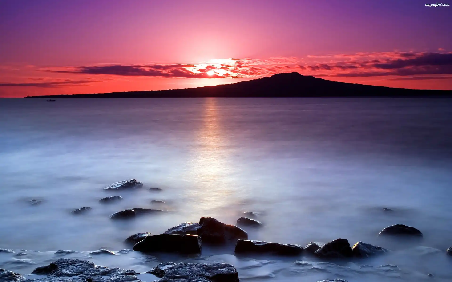 Zachód Słońca, Kamienie, Morze, Góry Na Pulpit