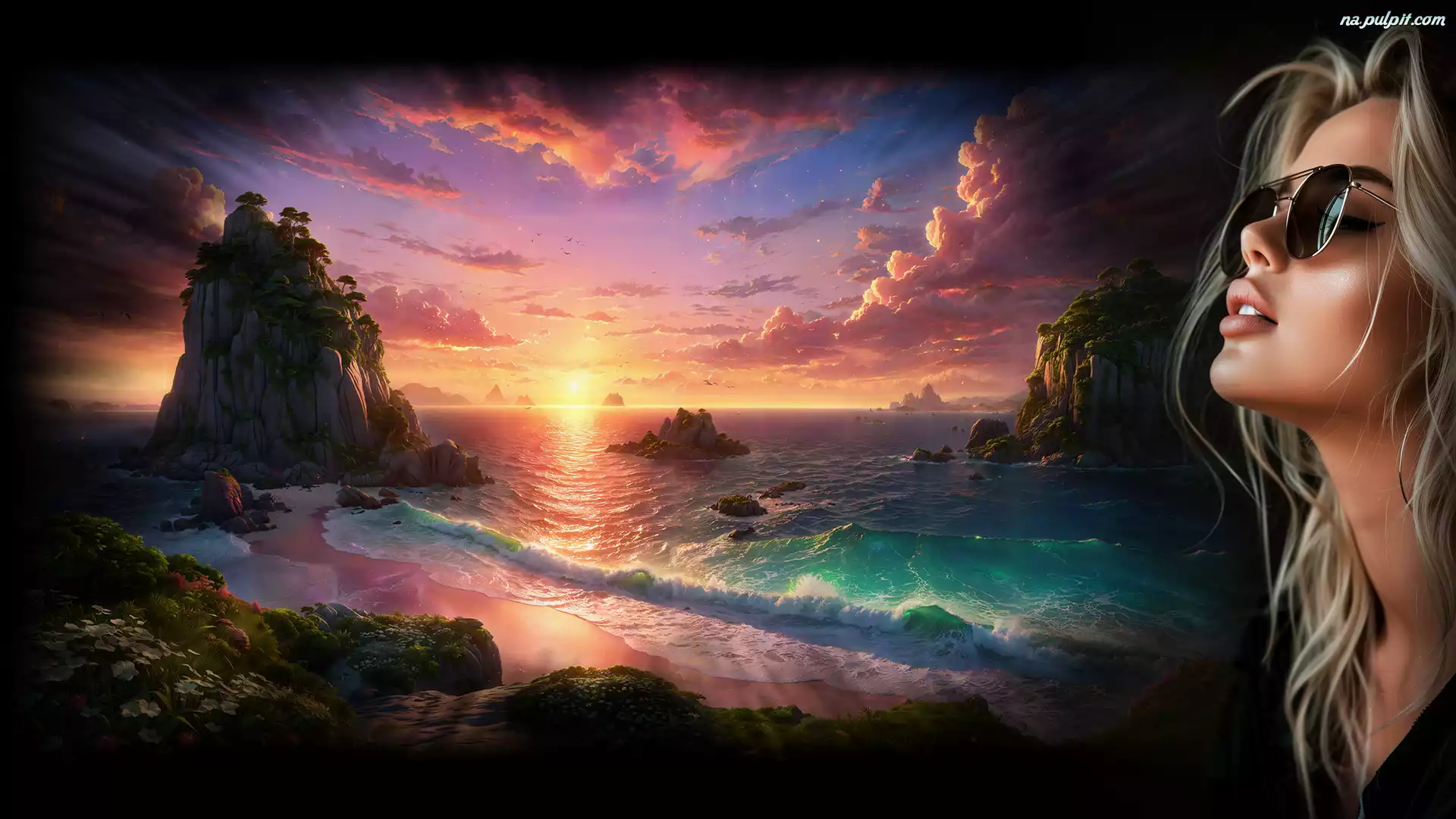 Skały, Dziewczyna, Okulary, Zachód słońca, Morze Na Pulpit