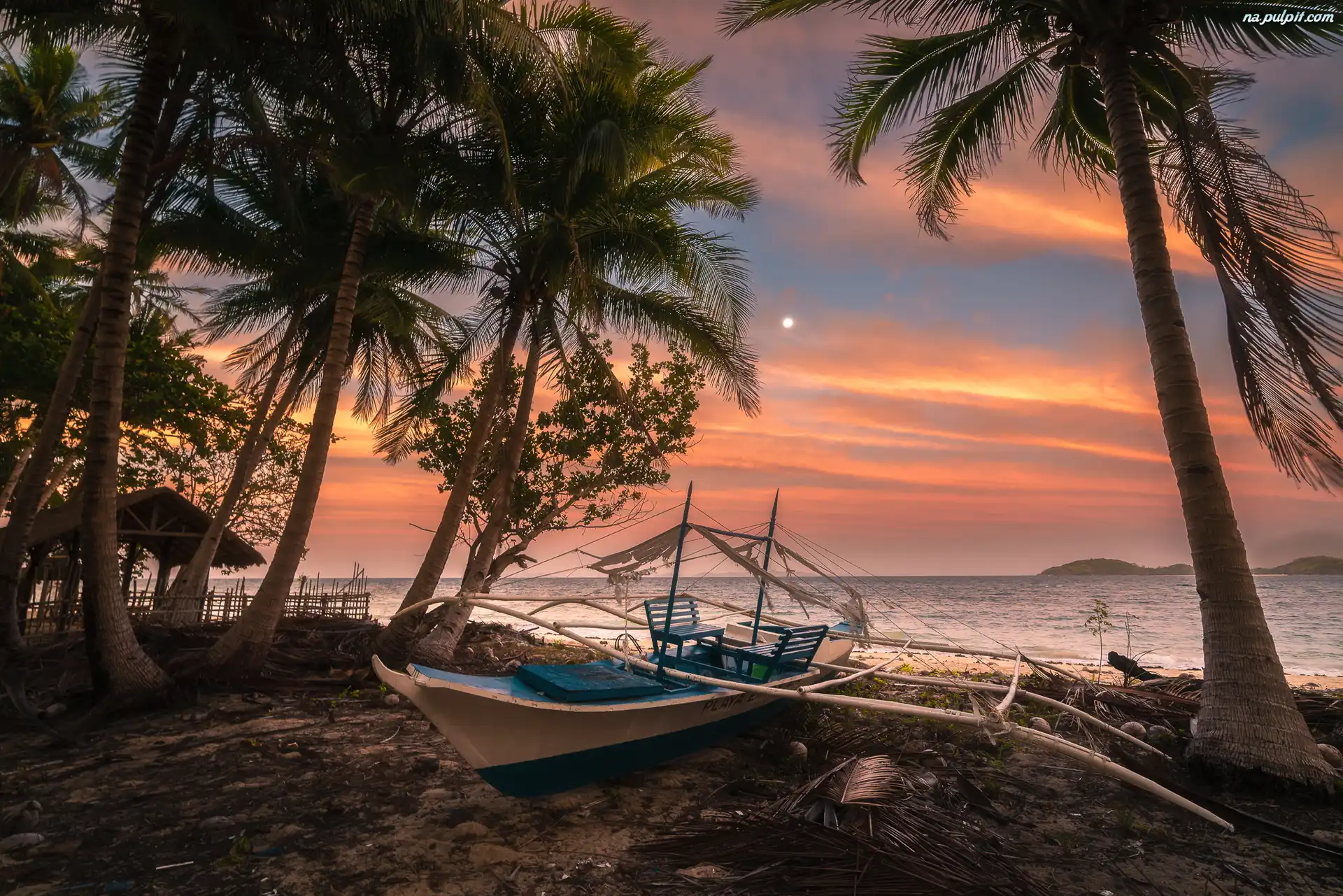 Łódka, Morze, Palmy, Zachód słońca Na Pulpit