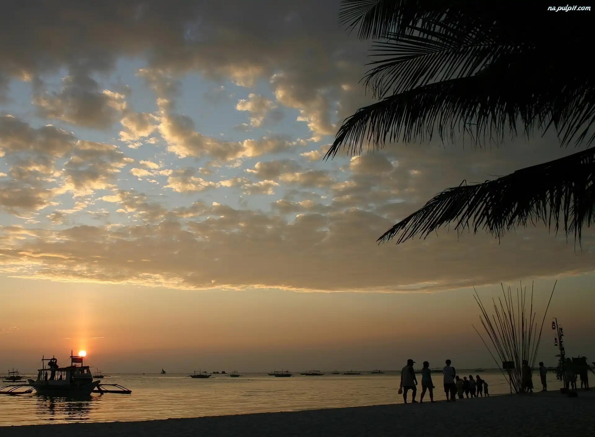 Zachód Słońca, Plaża, Morze, Ludzie Na Pulpit