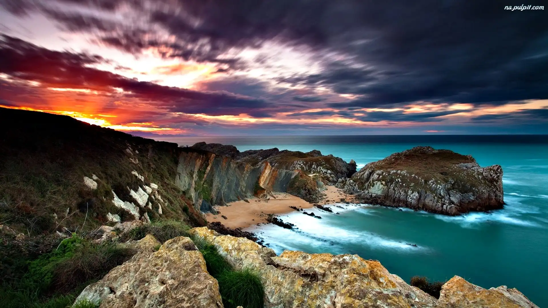 Zachód Słońca, Skały, Morze, Niebo Na Pulpit