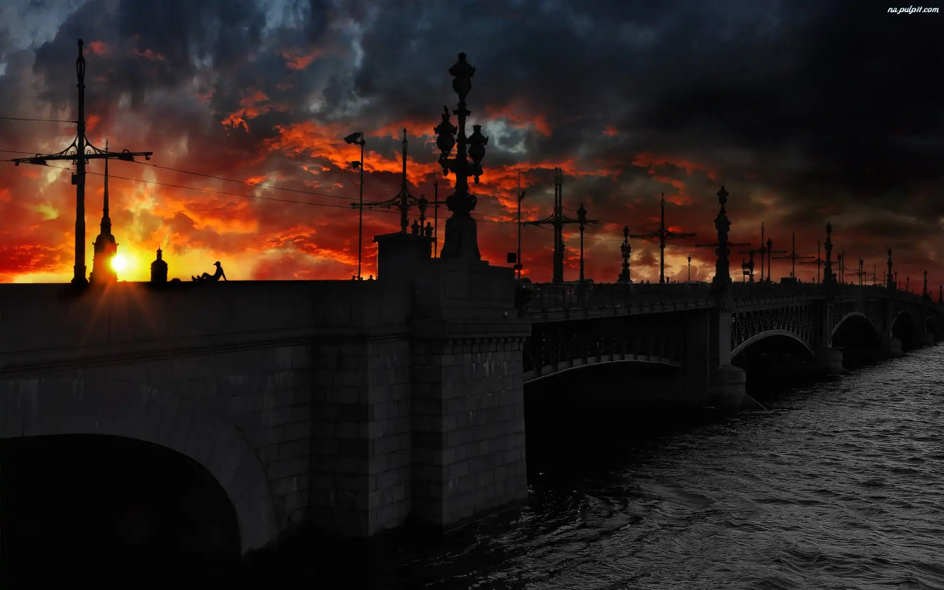 Zachód Słońca, Rzeka, Most, Chmury Na Pulpit