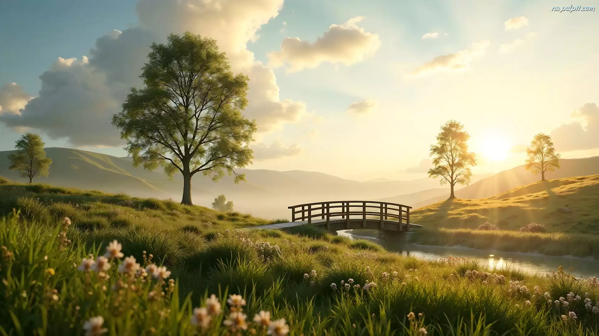 Drzewa, Łąka, Rzeka, Zachód słońca, Mostek Na Pulpit
