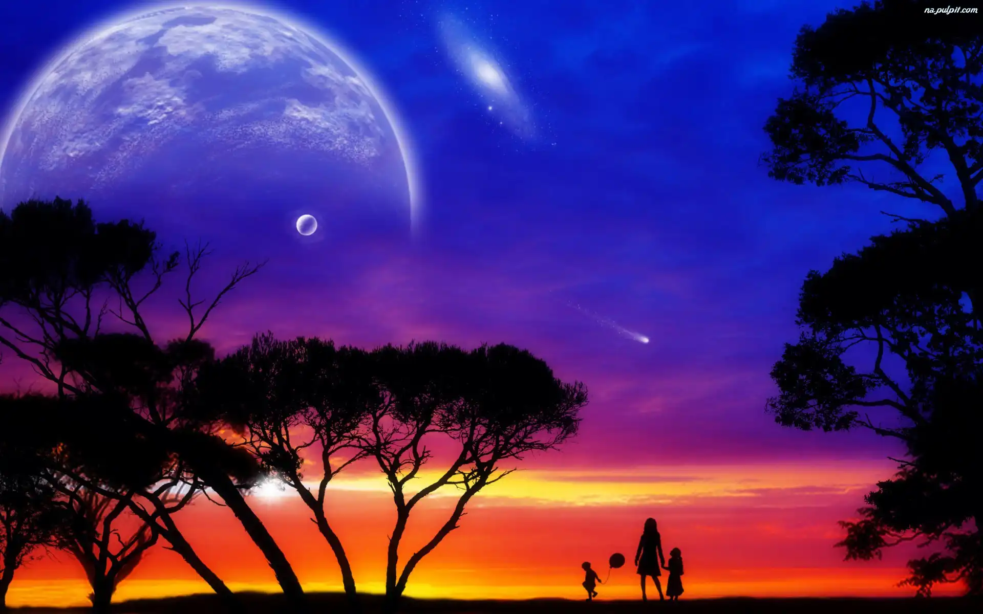 Zachód, Drzewa, Osoby, Księżyc, Niebo, Planety Na Pulpit